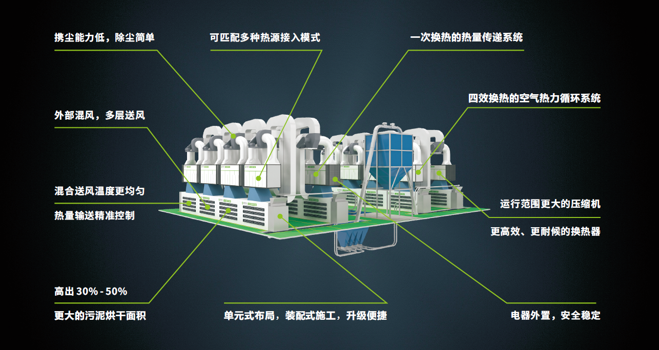 綠潤科技ICDS智能干化系統(tǒng)應(yīng)運(yùn)而生:此產(chǎn)品可匹配多種熱源接入模式,采用運(yùn)行范圍更大的壓縮機(jī),更高效、更耐候的換熱器;運(yùn)用外部混風(fēng)、多層送風(fēng)技術(shù),使混合送風(fēng)溫度更均勻、熱量輸送控制更精準(zhǔn),在此精準(zhǔn)控風(fēng)的環(huán)境下,設(shè)備攜塵能力更低,除塵更簡單,有效控制粉塵問題;同時(shí)采用比普通高出30%-50%的大型鏈網(wǎng),具有更大的污泥烘干面積,配合一次換熱的熱量傳遞系統(tǒng)、四效換熱的空氣熱力循環(huán)系統(tǒng),干化系統(tǒng)能效有了顯著的提升;整體設(shè)備采用單元式布局,大大降低設(shè)備占地面積,空間利用率高,全套系統(tǒng)采用裝配式施工,方便快捷,符合綠色建筑的要求,節(jié)能環(huán)保。